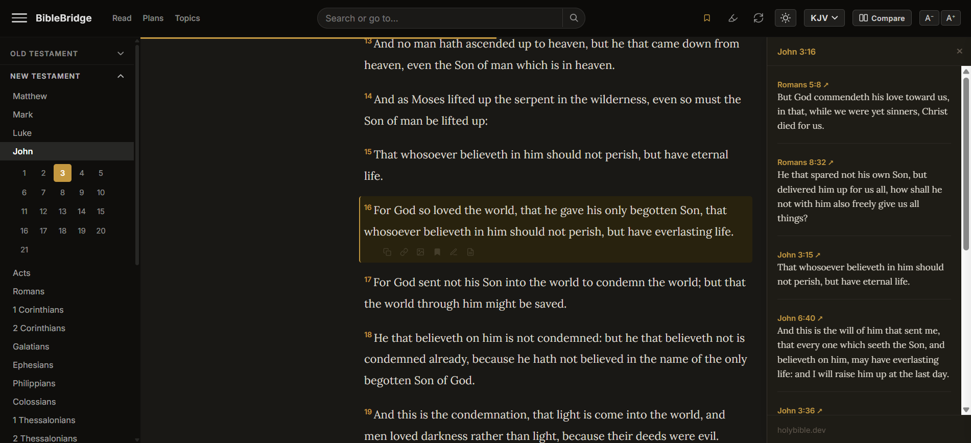 Type a reference, a keyword, or a phrase like “beatitudes.” Book filtering built in.